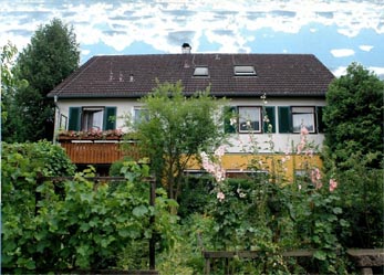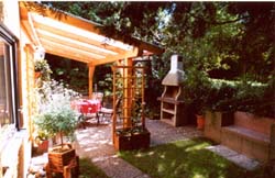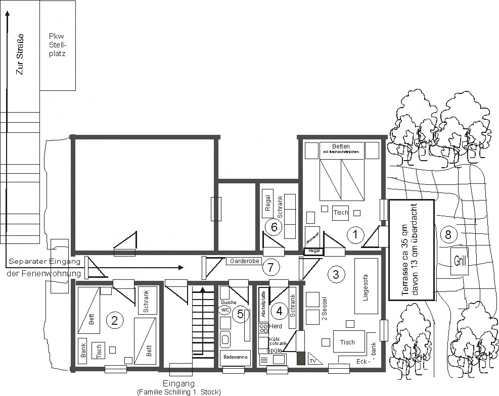 2 Liegestühle, grosser Grill, Sonnenschirm.